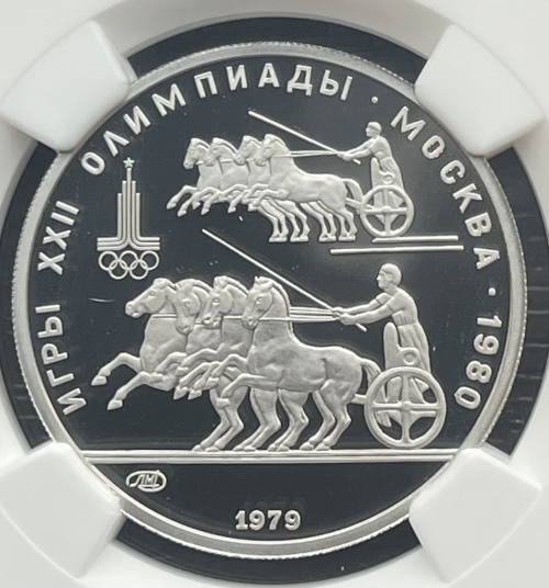 Слева и сверху вдоль канта слова «ИГРЫ XXII ОЛИМПИАДЫ», справа разделенные точкой слово «МОСКВА» и год проведения XXII Олимпиады «1980», сверху смещенная влево эмблема XXII Олимпийских игр, в середине гонки колесниц, ниже слева монограмма монетного двора «ЛМД», внизу у канта год выпуска монеты «1979».