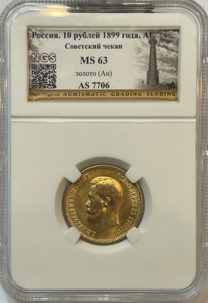 Золотая монета 10 рублей Николай II 1899г., в слабе NGS MS 63